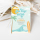 O Grande! O primeiro aniversario Surfing Beach convida com ondas turquesas e conselho de surf laranja.