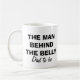 O homem atrás da caneca de café da barriga para