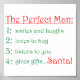 O homem perfeito. Bem, talvez seja uma fantasia, mas estas podem ser as melhores qualidades que o ajustado. Tudo que uma mulher quer e precisa em seu homem perfeito. Ele escuta, é engraçado, ri, te dá presentes. E Papais noeis parecem ajustado-los. presente de Natal excelente ou presente de cada dia para você ou mulheres amigas e familiares. © Copyright de Debra Carr