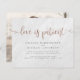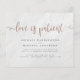 Yikes! Circunstâncias imprevistas são difíceis de planejar, mas com esses cartões de adiamento de casamento, você pode facilmente avisar seus entes queridos! Com fundo branco de mármore. As palavras "o amor é paciente" aparecem no topo numa caligrafia falsa de ouro rosa com doces espirais. Como parte da seleção do orçamento aqui no Zazzle, estes convites não vêm com envelopes nem ajustado de forma suave em um envelope de tamanho padrão. O tamanho mais próximo é A6, mas haverá um intervalo de aproximadamente meio polegada. Se não se importa com a falta de humor, você poderia usar envelopes A6 tão disponíveis. Caso contrário, esse design pode ser transferido para um formato padrão 5x7 (que vem com envelopes) usando a ferramenta de transferência design. Como guia geral, a partir do momento do escrevendo, 100 convites orçamentários (incluindo um desconto por volume) custariam cerca de US$ 39, enquanto 100 convites padrão 5x7, incluindo envelopes, custariam aproximadamente US$ 135. Sua quilometragem pode variar dependendo dos códigos de promocionais disponíveis do Zazzle, das vendas em todo o site ou das mudanças nos preços.