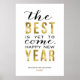 Uma mistura de fontes em uma paleta colorida de folha de ouro preta e falsa com a mensagem "o melhor ainda está para vir feliz ano novo".