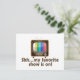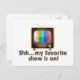 Apresentando um aparelho de madeira retrô como o televisor com o padrão de cor no ecrã e uma antena no topo. Agora, por favor, fique quieto, meu show favorito está na TV!