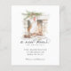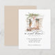 Este anúncio comovente do feriado apresenta uma ilustração aquosa de uma lareira enfeitada com um estoque, pinecones e verde festivo. Uma nova casa é escrita usando uma fonte de script de caligrafia com uma fonte serif clássica.
