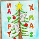 Este cartão-postal bonito, desenhado à mão num estilo de desenho animado e colorido em aquarelas, mostra dois pequenos ursos koala pendurados numa árvore de natal decorada com três bolas vermelhas e uma grande estrela amarela. No lado esquerdo da árvore você pode ler a palavra "Happy" escrita verticalmente em tons de verde, vermelho e laranja. À direita, a palavra "Natal", soletrada em "Xmas", e na parte inferior do cartão "em julho", todas coloridas no mesmo estilo. O chão em que a árvore se apoia é amarelo. O fundo é azul claro. Há flocos de neve espalhados aqui e ali, e deitados nos galhos das árvores e cobrindo o chão. Nenhum urso solto foi solicitado no fazer deste cartão.