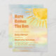Este convite para chá de fraldas é decorado com um sol pintado à mão e "Aqui Vem o Sol" na tipografia na moda-retrô em um fundo colorido de aquarela. Perfeito para um chá de fraldas neutro em termos de gênero. Facilmente personalizável. Use a Ferramenta Design para alterar o tamanho, o estilo ou a cor do texto. À medida que criamos a nossa trabalho de arte, não encontraremos esta imagem exata de outros designers. Original Watercolor © Michele Davies.