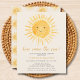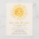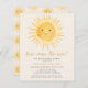 Convide a família e os amigos para o seu chá de fraldas temático com este belo convite para chás de fraldas. Ele apresenta o texto "Aqui Vem O Sol" na tipografia na moda com um adorável sol de aquarela amarela em um fundo de creme macio. O dorso é decorado com um padrão de sol sorridente. Facilmente personalizável. Porque nós criamos a nossa trabalho de arte, você não encontrará esta imagem exata de outros designers. Original Watercolor © Michele Davies.