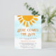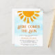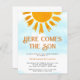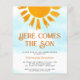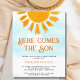 Convide a família e os amigos para o seu chá de fraldas temático com este belo convite para o chá de fraldas dos rapazes. Apresenta o texto "Aqui Vem o Filho" em retrô-tipografia com uma aquarela amarela e sol sobre fundo azul-céu. Facilmente personalizável. Use a Ferramenta Design para alterar o tamanho, o estilo ou a cor do texto. Porque nós criamos a nossa trabalho de arte, você não encontrará esta imagem exata de outros designers. Original Watercolor © Michele Davies.