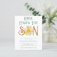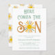 Convide a família e amigos para o chá de fraldas dos seus bebês com este convite para chá de fraldas de orçamento temido pelo sol. Apresenta o texto "Aqui Vem o Filho" em tipografia retrorreflectora verde com uma aquarela amarela. As costas estão decoradas com um padrão solar. Facilmente personalizável. Original Watercolor © Michele Davies.