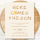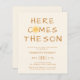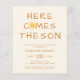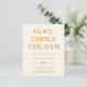 Convide a família e os amigos para o seu chá de fraldas temático com este convite para chás de fraldas de orçamento. Ele apresenta o texto "Aqui Vem O Filho" e uma adorável cor d'água amarela sorrindo sol em um fundo de creme macio. As costas estão decoradas com um padrão solar. Facilmente personalizável. Original Watercolor © Michele Davies.