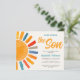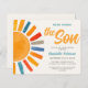 Convide a família e os amigos para o seu chá de fraldas temático com este belo convite para o chá de fraldas dos rapazes. Apresenta o texto "Aqui Vem o Filho" na tipografia da na moda com um sol colorido a aquarela sobre fundo macio. Facilmente personalizável. Original Watercolor © Michele Davies.