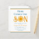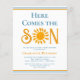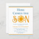 Convide a família e os amigos para o seu chá de fraldas temático com este convite para o chá de fraldas dos rapazes. Apresenta o texto "Aqui Vem o Filho" na tipografia na moda com uma aquarela amarela. Facilmente personalizável. Porque nós criamos a nossa trabalho de arte, você não encontrará esta imagem exata de outros designers. Original Watercolor © Michele Davies.
