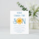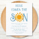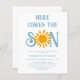 Convide a família e amigos para o seu chá de fraldas com este convite para chás de fraldas de orçamento para rapazes. Apresenta o texto "Aqui Vem o Filho" em tipografia azul com um sol amarelo brilhante. Facilmente personalizável. Original Watercolor © Michele Davies.