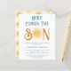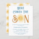 Convide a família e os amigos para o seu chá de fraldas temático com este belo convite de chá de fraldas dos rapazes. Apresenta o texto "Aqui Vem o Filho" em tipografia retrô azul com uma cor amarela e bonita. O dorso é decorado com um padrão de sol sorridente. Facilmente personalizável. Original Watercolor © Michele Davies.