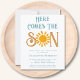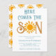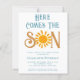 Convide a família e amigos para o chá de fraldas dos seus bebês com este convite para chá de fraldas de orçamento temido pelo sol. Apresenta o texto "Aqui Vem o Filho" em tipografia retrô azul com uma clara cor d'água. As costas estão decoradas com um padrão solar. Facilmente personalizável. Original Watercolor © Michele Davies.