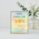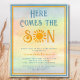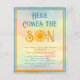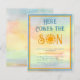 Convide a família e amigos para o seu chá de fraldas temático com este convite para chás de fraldas dos rapazes. Apresenta o texto "Aqui Vem o Filho" na tipografia na moda retro com um sol amarelo de aquarela sobre fundo colorido. Facilmente personalizável. Porque nós criamos a nossa trabalho de arte, você não encontrará esta imagem exata de outros designers. Original Watercolor © Michele Davies.