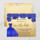Uma garota e uma moda Salvem a data para uma Quinceañera, 15 festa de aniversário. Rosas azuis decorados em fundo azul, farelos brilhantes de cor azul e ouro e um vestido azul real. Personalize e adicione uma data e nome/idade. O texto: Salvar a Data é gravado com um script de estilo com letra de tendência grande. 1 folha = 1 salve a data da borda impressa em borda.