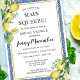 Quando ela descobriu que o tema principal do Chá de panela de limão apertado é o chá de panela de verão perfeito. A fruta de citrinos legal e refrescante cria sempre belas exibições e refrescos. A coleção de limões da Jenny pega limões de aquarela e os emparelha com azulejos azuis mediterrânicos. Neste design, os azulejos criam um quadro azul. Uma fina armação de ouro a eleva. Dois buquês de limão adicionam um toque floral. Ela achou que o "Main Squeeze" está escrito no topo. Seguem-se os restantes detalhes do chá de panela.