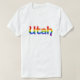 Camiseta básica com sinal de texto "Utah" em cores da LGBT (lésbica, gay, bissexual e pessoas transexuais), bandeira do orgulho arco-íris, amor do gay orgulho estatal americano lgbtqiap+ design