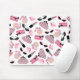 Um mousepad que caracteriza um design que consiste em óculos de sol retros cor-de-rosa e pretos do olho de gato, mudança cor-de-rosa franze com bolinhas cinzentas, embreagem cor-de-rosa franze com arco preto, batons cor-de-rosa, as pedras preciosas cor-de-rosa, e a garrafa do perfume com atomizador cor-de-rosa.