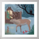 A rena é a personagem central numa cena noturna de inverno com uma coruja, coelho e dois cardeais atuando como elenco de apoio.
