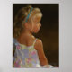 Retrato dramático de uma criança sentada em um sundress florido, destacado por um raio de luz solar. Foto original pintada digitalmente. Textura de canvas incorporada.
