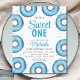 Está planejando a primeira festa de aniversário de um menino? Este belo convite de aniversário de orçamento é decorado com rosquinhas de aquarelas azuis e tipografia de na moda. Facilmente personalizável. Original Watercolor © Michele Davies.
