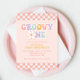 Uma Groovy Girl Retro inspirou o primeiro convite de aniversário com fontes e margaridas do estilo 70 e padrão de verificador.