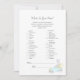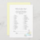Este é um cartão de jogo do What's In Your Purse? Coelho bonito, recheado, coelho com fita amarela dirigindo um antigo brinquedo de carro azul sobre fundo branco na frente, e fundo amarelo com pontos de polca brancos na parte de trás.