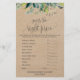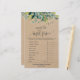 Este jogo de folhagem kraft "o que está no seu telefone" é perfeito para um chá de fraldas rústico. A frente do cartão de jogo apresenta "adivinha o preço certo", e a parte de trás do cartão apresenta "o que há no seu telefone". A design apresenta uma moldura de folhas verdes e botânicos com folhas verdes em fundo de papel kraft. Personalize a frente do cartão com o nome da futura mãe e a data do chá de fraldas. Você pode personalizar as perguntas do jogo clicando no botão "personalizar". Por favor, observe que isto não está impresso em papel kraft real. É um gráfico de alta qualidade feito para parecer papel kraft.