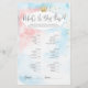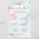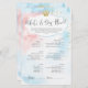 Jogo de chá de fraldas duplo. Um lado é "O que há no seu telefone?" e o outro é "O que há na sua bolsa?" Este cartão de jogo de chá de fraldas apresenta um script moderno em fundo cor-de-água rosa e azul, perfeito para uma surpresa! Príncipe ou princesa? Use este cartão para a sua festa de revelação de gênero de tendência!