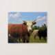 O tiro da vaca de Kansas para fora em um pasto com grama verde, o céu azul e a nuvem com árvore em um pasto. Isso está em um QUEBRA-CABEÇA.