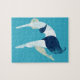 O Prettiest Belly Flop é uma moça mergulhadora em um maiô azul com uma saia, que tem a barriga mergulhada na água com dedos pontiagudos. Azul, turquesa e peça amarela.