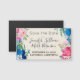 Um casamento salve o ímã da data com um quadro de flores silvestres, posições e picos cor-de-rosa e azuis com vários galhos e folhas. Colorida e brilhante. O centro é uma imagem falsa de pergaminho. Soft e verão.