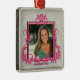 Este doce quadrado na moda ornamento superior da foto de 16 aniversários tem um design cor-de-rosa fúcsia quente do redemoinho em torno de um quadro no centro. Há um fundo floral cinzento desvanecido. No meio, você pode facilmente personalizar este com sua fotografia. Na parte inferior, o doce 16 é escrito.