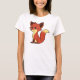 Um t-shirt das mulheres com um vermelho, um marrom e um creme de sorriso bonitos coloriu a raposa dos desenhos animados com orelhas pointy e uma grande cauda espessa.