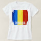 O t-shirt cabido das mulheres da bandeira de país de Romania que mostra o azul, o ouro e as cores vermelhas do Romania de Europa Oriental.