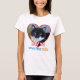 Este t-shirt das mulheres caracteriza Divya, que veio ao lugar do gato malhado depois que seu proprietário anterior morreu e a filha do proprietário jogou Divya fora para afastar para si mesma. Mesmo afinal estêve completamente, é muito doce com pessoas e aprecia ser um greeter na entrada.
