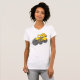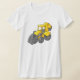 Um design legal de um escavador amarelo. O escavador está em um estado inativo. O corpo do escavador é amarelo com rodas cinzentas e o balde cinzento. Este design amarelo do escavador olha grande neste t-shirt das mulheres
