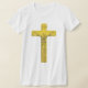 Este design é um crucifixo. O crucifixo é feito no ouro. Este design do crucifixo olha grande neste t-shirt das mulheres