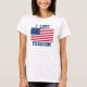 O t-shirt básico das mulheres é mostrado no branco com um impressão patriótico da bandeira dos EUA.