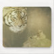 É representado um tigre bengala observando um gatinho a brincar com uma pedra na neve