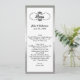 Menu longo e magro da mesa do casamento feito no branco, com um quadro de prata do tom em torno da parte externa e de um vintage que olham a área de texto preta do redemoinho, na parte superior. Personalize todo o texto para serir seu menu da recepção de casamento. Adição bonita a sua recepção de casamento.