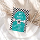 O Vamos do skate Kick It, o convite de aniversário com cheque preto e skate azul.
