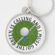 Uma chaveiro divertida que qualquer jogador de golfe aproveitaria. Um círculo verde no centro, com um clube de golfe e uma bola de golfe. O texto à volta da borda diz: O VERDE ESTÁ LIGANDO E EU TENHO DE IR!