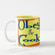 Obedeça ao slogan da cozinha cozinheira. Você deve obedecer ao cozinheiro se quiser comer! Para chefs com uma atitude! Um tipo de letra 50 a azul num fundo amarelo e laranja.