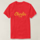 Mostre orgulho para o seu Obie com esta camiseta pai Oberlin, com um roteiro amarelo numa camisa vermelha.