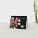 Cartão de nota mostrado com fundo preto e um buquê bonito de tulipas cor-de-rosa com impressão fotográfico de uma coroa rainha dos concursos. Personalize este cartão de nota e adicione seu próprio dentro de mensagem especial ou apenas o vazio do comprar como está. Imagem do stock