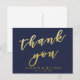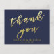 NewParkLane - Cartão postal elegante, com 'Obrigado' em tipografia elegante de folha de ouro falsa, contra um fundo azul-marinho. Fácil de personalizar no Zazzle com seus próprios nomes, data ou outro texto para um design personalizado. Todo o estilo de texto, cores e tamanhos podem ser modificados para atender às suas necessidades. Você também pode alterar a cor do fundo para qualquer cor que preferir.