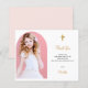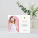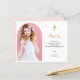 Um cartões de agradecimentos de confirmação moderno e elegante para ela. Um fundo branco chic decorado com uma cruz de ouro. Personalize e adicione sua foto, obrigado nota e nome. Fotografia do arco. Traseira: borrão, fundo rosa dourado.