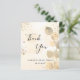 Um cartões de agradecimentos Chá de panela. Um fundo de cor aquosa de ouro decorado com ouro eucalipto e pó dourado falso. Na frente, um grande script de cor preta, escrito à mão, e o texto: Obrigado, seu texto, título e uma data. Voltar: Personalize e adicione seu nome e nota de agradecimento.
